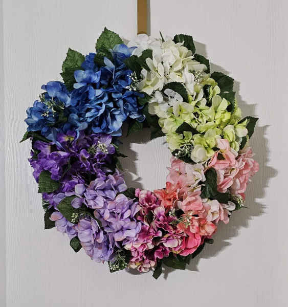 Five colors of hydrangeas arranged around this gorgeous wreath.